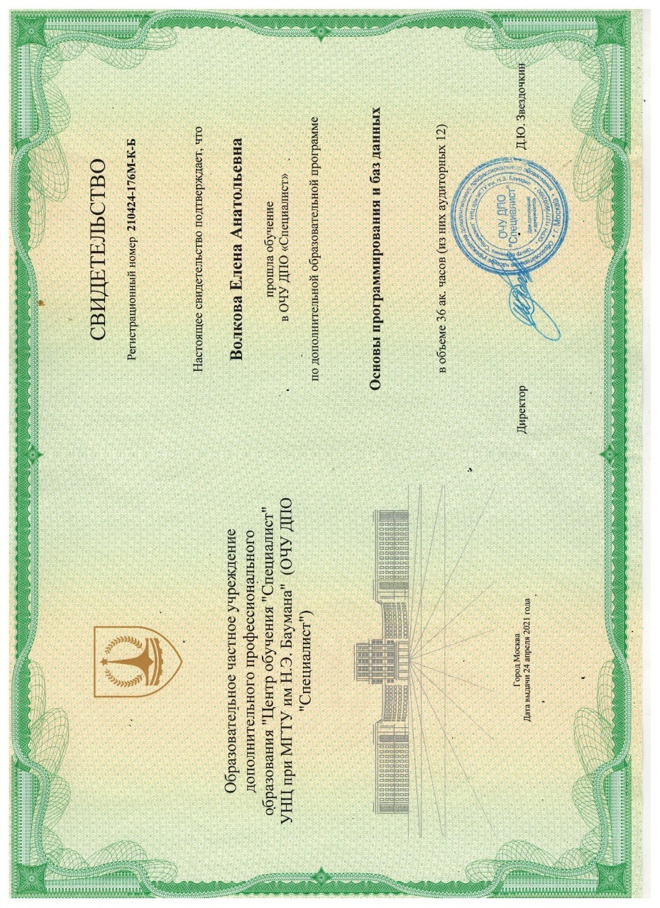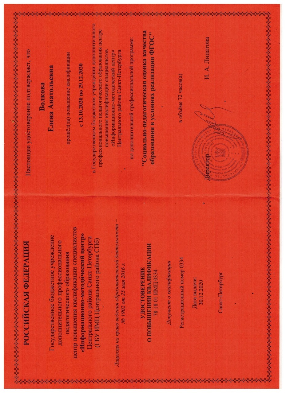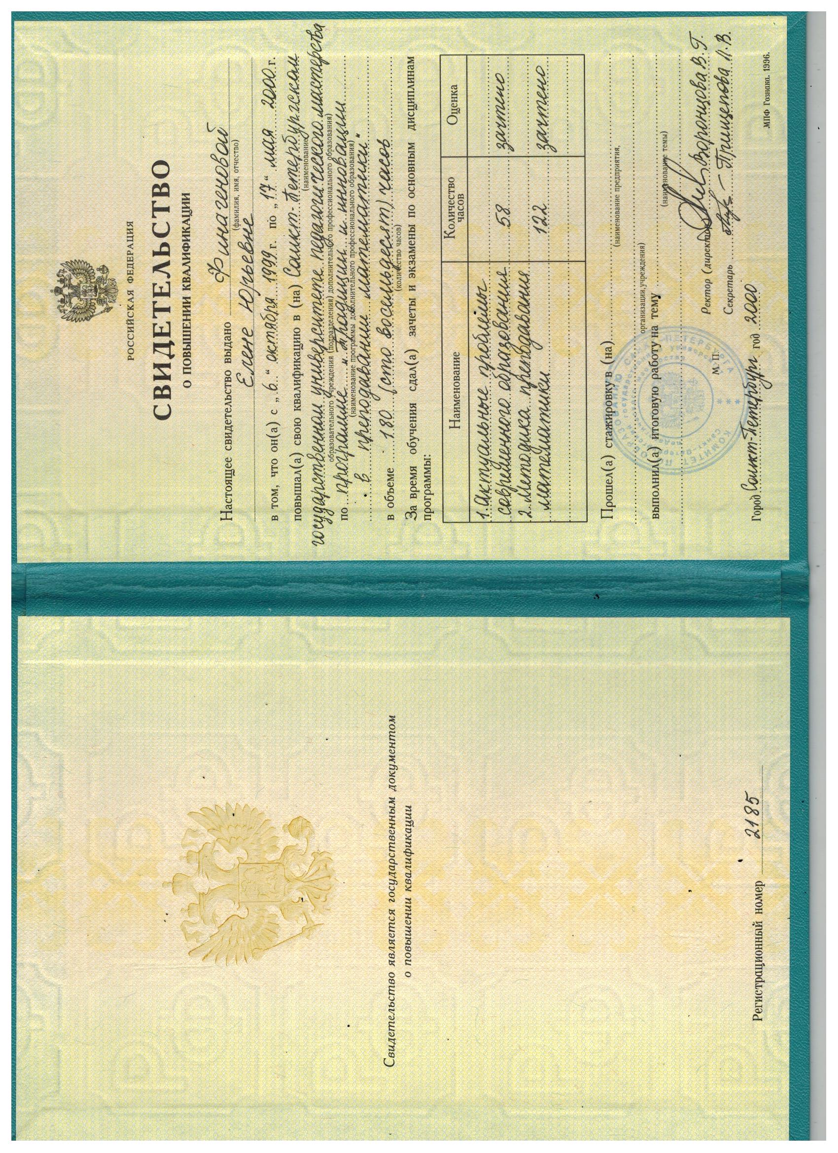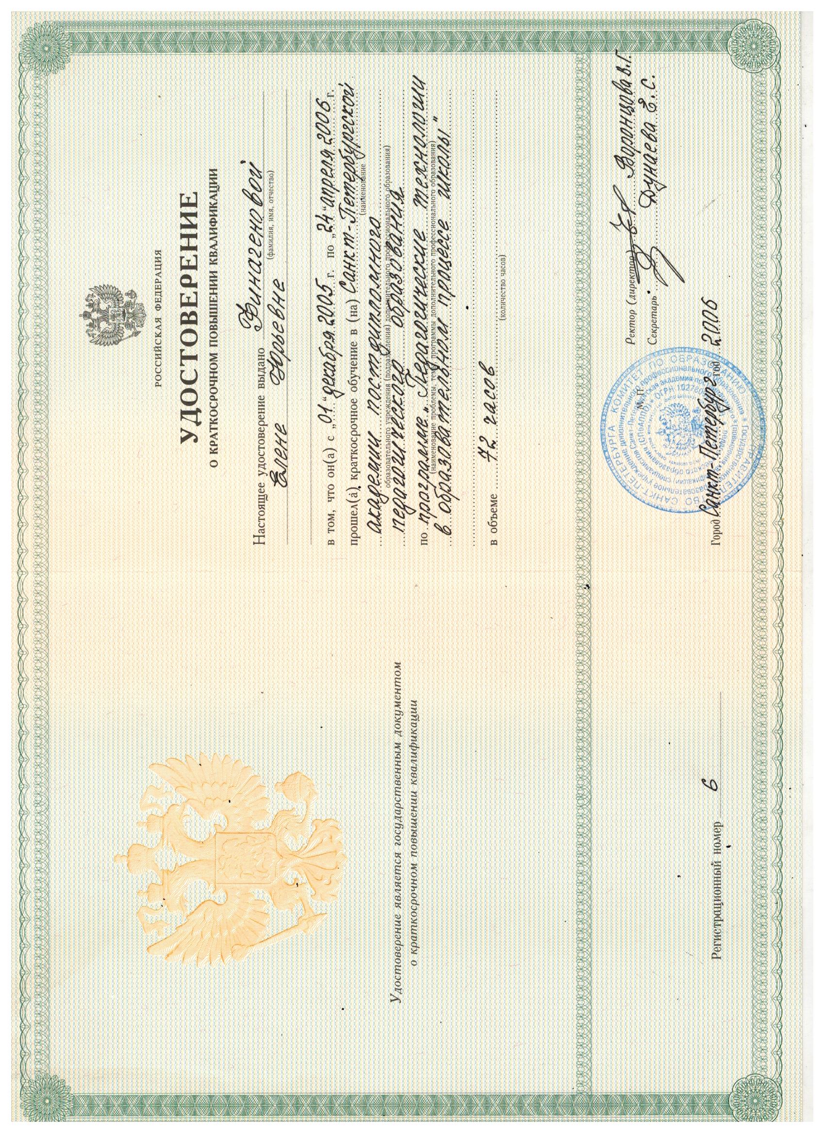 2006г. Повышение квалификации по программе «Педагогические технологии в образовательном процессе школы» в Санкт-Петербургской Академии Постдипломного Педагогического Образования.