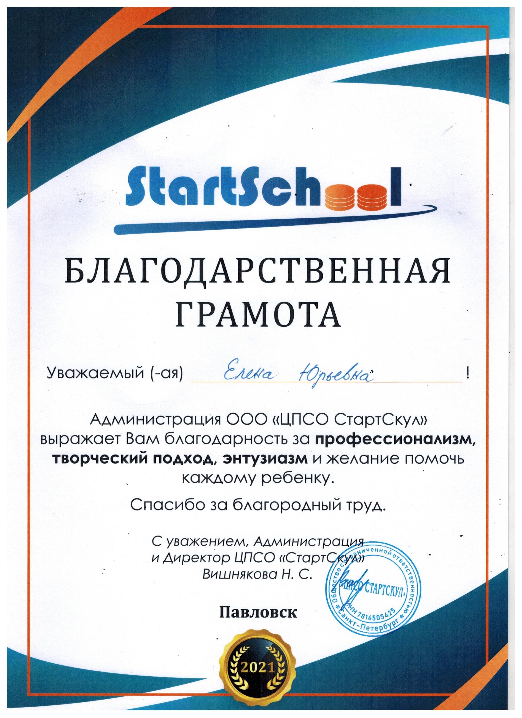 В 2005 году Елене Юрьевне присвоена высшая квалификационная категория. А также Елена Юрьевна имеет многочисленные дипломы, грамоты и благодарности за труд на благо детей, многие ее учащиеся становились победителями и призерами олимпиад, в том числе и международных