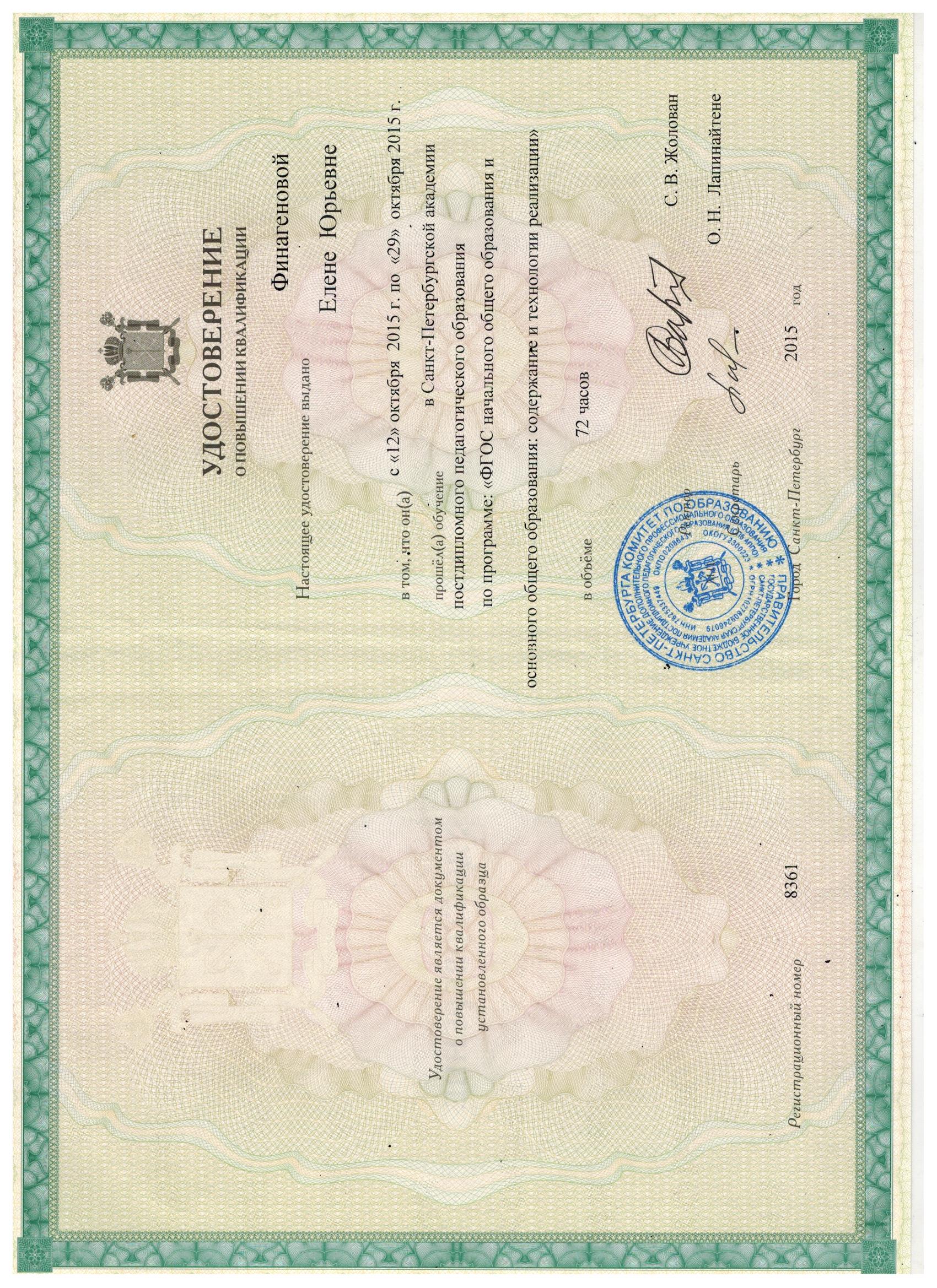 2014г. Повышение квалификации по программе «ФГОС начального общего образования и основного общего образования: содержание и технологии реализации» в Санкт-Петербургской Академии Постдипломного Педагогического Образования.