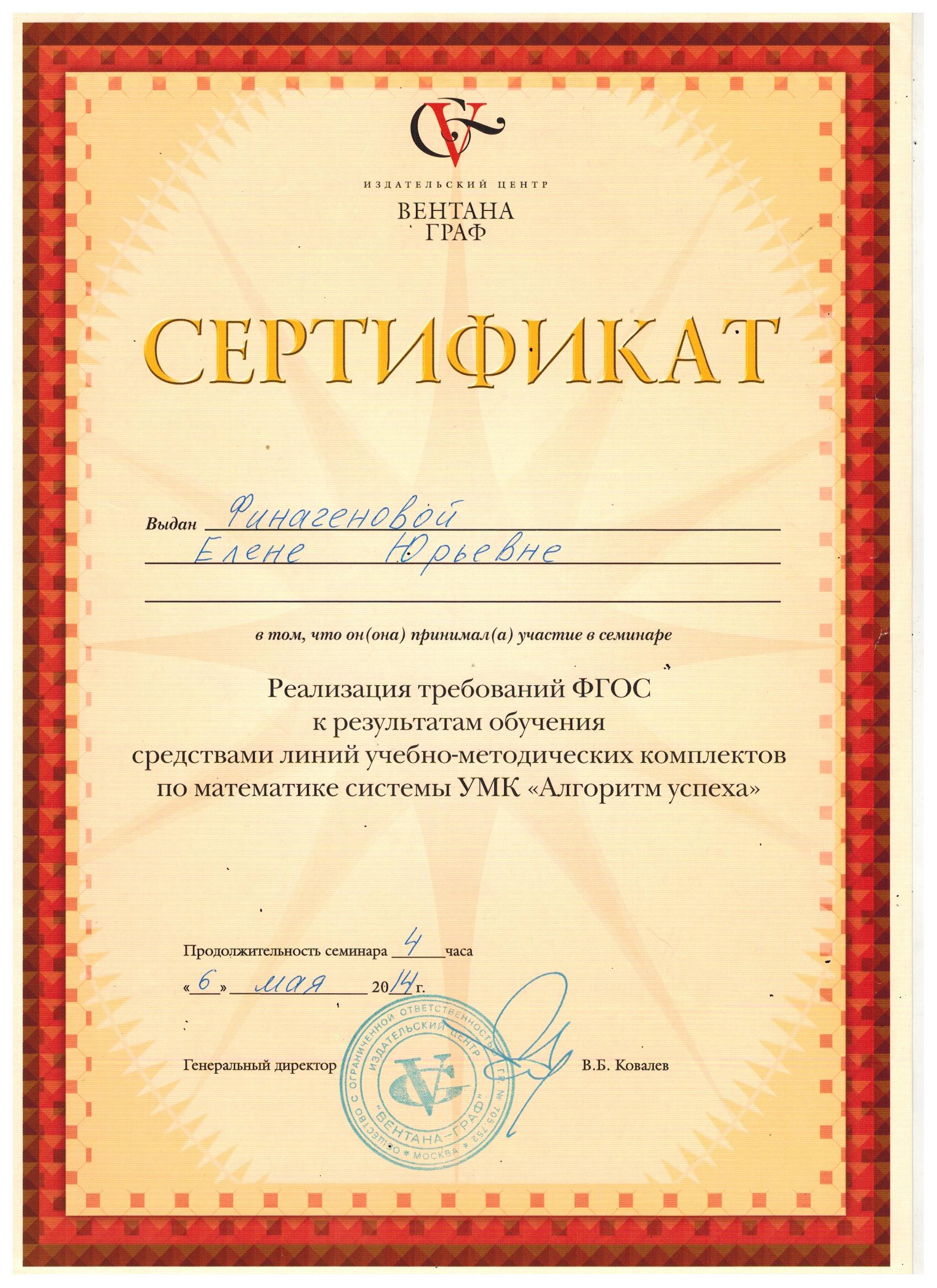 2015г.Повышение квалификации по программе «Реализация требований ФГОС к результатам обучения средствами линий учебно-методических комплектов по математике системы УМК «Алгоритм успеха» в Санкт-Петербургской Академии Постдипломного Педагогического Образования.
